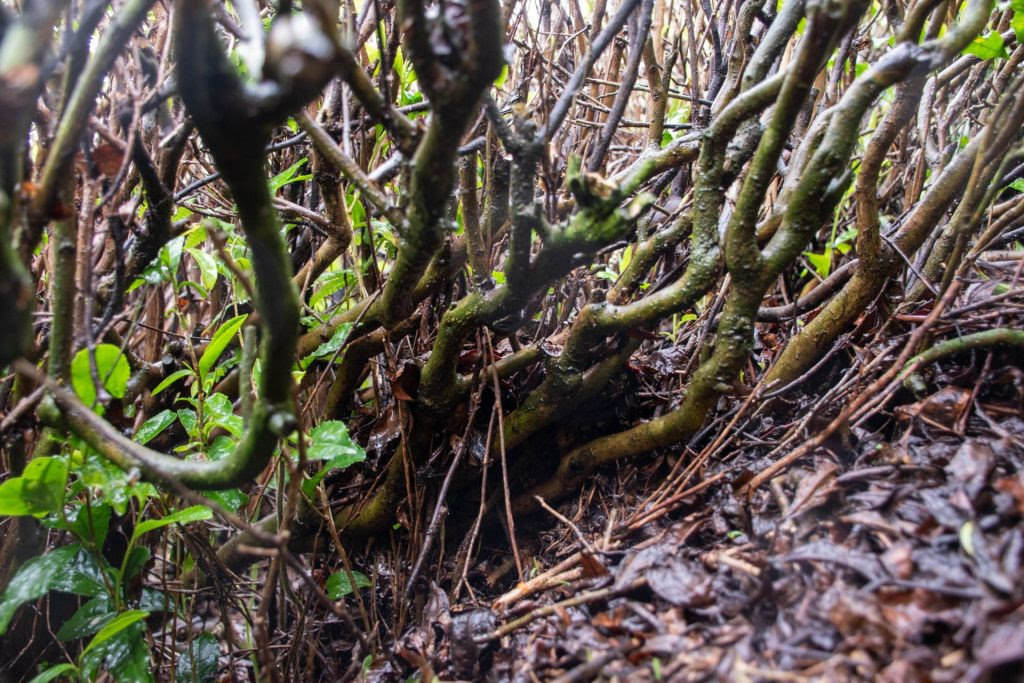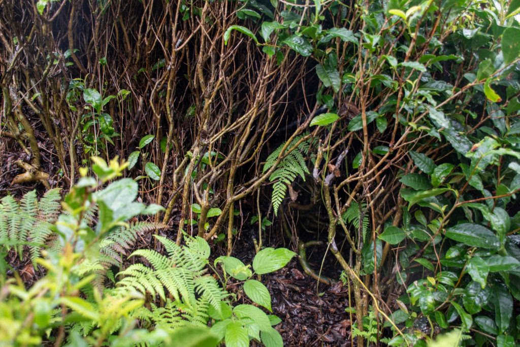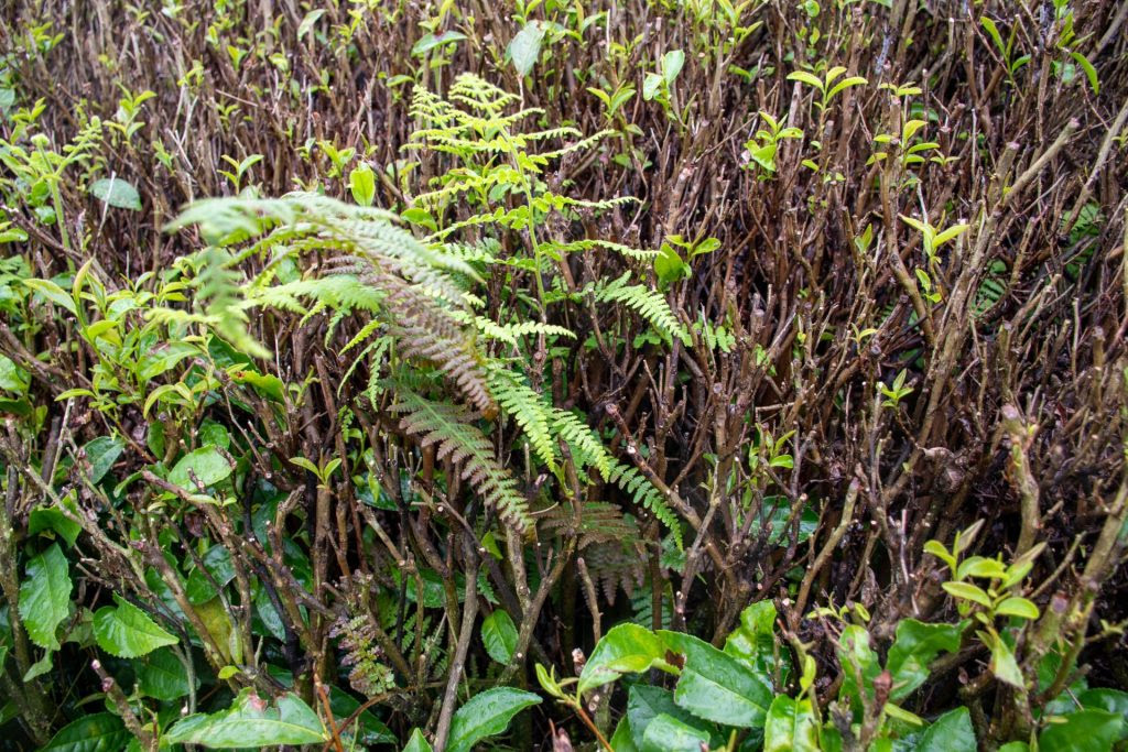 “Inoltre, miro a mantenere uno spazio sufficiente anche tra i rami. Poto i miei alberi del tè in questo modo, ma anche le felci aiutano in ciò. Quando le felci appassiscono, i rami sul lato interno degli alberi del tè diventano naturalmente fragili e si staccano. Le felci amano crescere in spazi affollati, ma fanno spazio anche a se stesse. Quindi, mentre strisciano attraverso le strette aperture, spingono via i rami che si trovano in mezzo per fare più spazio. Quando le felci appassiscono, si sarà creato spazio all’interno dell’albero del tè.”